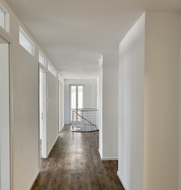 Das sehr gepflegte Büro erstreckt sich über zwei Ebenen, Erdgeschoss und Untergeschoss. Die beiden Geschosse sind durch eine geschickt platzierte Wendeltreppe miteinander verbunden. Es besteht aber auch die Möglichkeit des Zugangs über die voneinander getrennten Eingänge. Den im Untergeschoß befindlichen Eingang erreicht man über das Treppenhaus oder ganz bequem mit dem Aufzug. Alle Büros sind freundlich hell und verfügen über einen Fußbodentank. Die modern inszenierten Toiletten erhielten weiße großformatige Fliesen als Wandbelag, dunkles Feinsteinzeug als Bodenbelag. Die Teeküche ist nicht möbliert. Hier kann sich der Mieter nach eigenen Vorstellungen einrichten. Die Vielfalt der Räume genießt man in Helligkeit und Komfort. Für kreative Pausen bietet sich die mit einer Buchenhecke sichtgeschützte Terrasse an. Die Ausrichtung nach Süd-Ost ist ein Sonnengarant für den ganzen Bürotag.